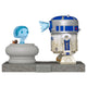 El diseño presenta a R2-D2 con su inconfundible cuerpo en tonos blanco, azul y plateado, acompañado de un holograma translúcido de Leia en miniatura, recreado con un efecto luminoso que aporta profundidad y realismo. La base texturizada refuerza la sensación de estar ante un momento legendario de la historia del cine.