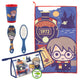 El set incluye un neceser, una toalla, un cepillo para el pelo y un vaso, todos decorados con ilustraciones caricaturescas de Harry Potter y el tren Hogwarts Express número 5972, listo para partir hacia una nueva aventura. Los tonos granates y dorados, propios de la casa de los valientes, aportan un toque cálido y reconocible a cada pieza.