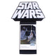 Su columna blanca cuenta con un elegante borde iluminado mediante LEDs blancos, rematado con el icónico logo de Star Wars en la parte superior, que brilla con intensidad y convierte este soporte en una pieza decorativa única. La base incluye una ilustración inspirada en los cómics y estética visual del universo galáctico, aportando un toque coleccionista y totalmente temático.